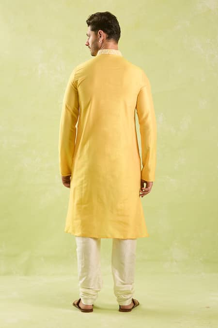 Buy_Arihant Rai Sinha_Yellow Polyester, Silk, Chanderi Embroidery Floral Jaal Placket Kurta Set _at_Aza_Fashions