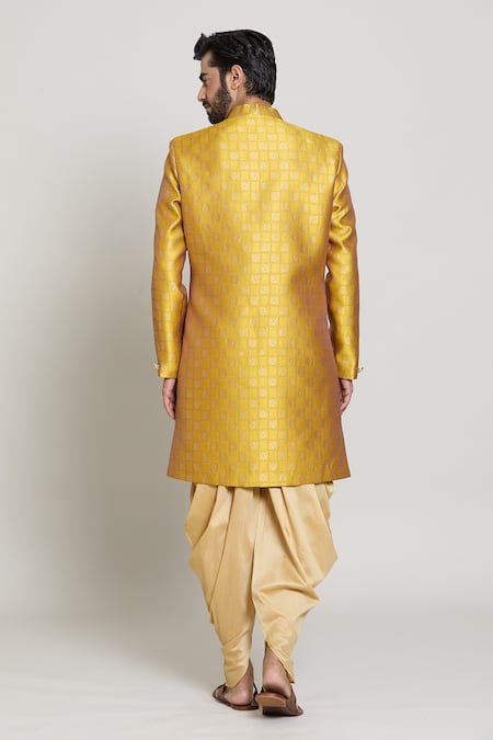 Yellow jacquard kurta featuring a band collar and full sleeves with floral jaal woven detail. Paired with a gold peshawari pant for a complete look.