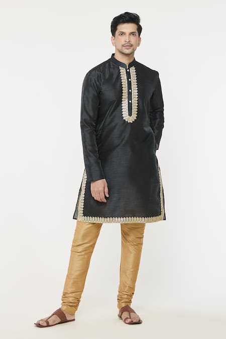 Black kurta featuring floral lace embellishment on the placket and hem. Paired with a gold churidar made from art silk.