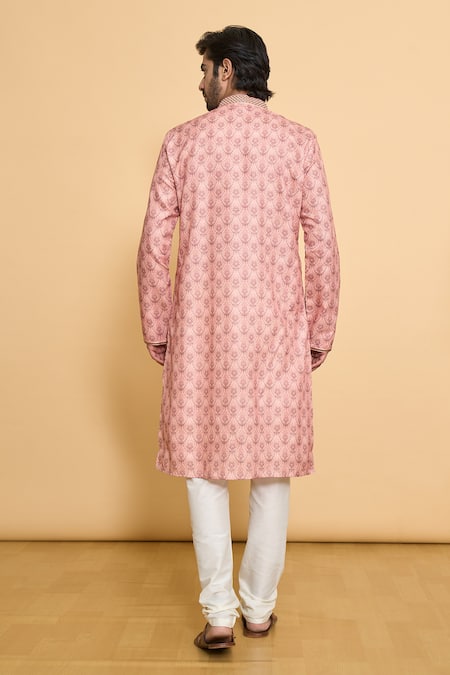 Peach kurta featuring all over floral vine prints and a stand collar. Paired with a coordinating churidar in a relaxed fit.