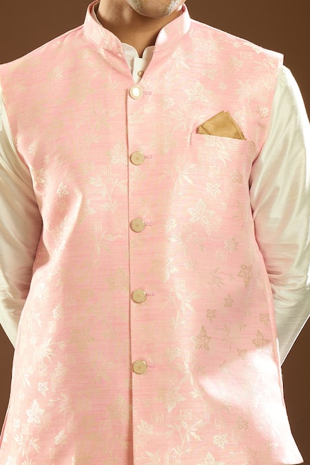 Pink jacquard banarasi silk bundi featuring an all-over floral pattern. Paired with an off-white kurta and churidar, this set is designed for comfort with side slits and front button detailing.