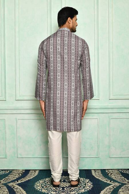Grey kurta featuring a floral pattern and mandarin collar. Paired with a white churidar made of art silk.