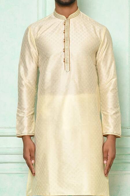 Light gold kurta featuring floral motifs, embroidered collar & placket. Paired with a churidar for a complete look.