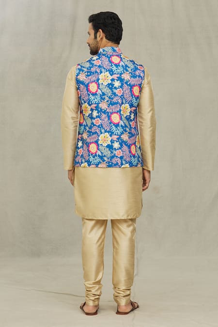 Blue floral print bundi with a mandarin collar and front button closure. Paired with a gold silk kurta featuring a front button closure and churidar with a drawstring.