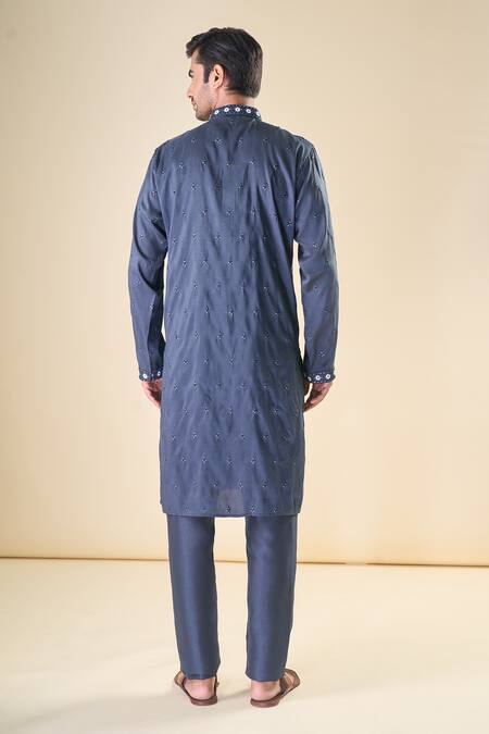 Black silk blend straight kurta featuring sequin and thread embroidered floral motifs. Paired with a coordinating solid pyjama.