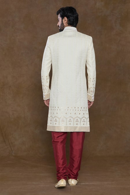 Off-white sherwani featuring sequin and bead hand work in floral stripe pattern. Paired with a maroon churidar and an embellished hem dupatta.