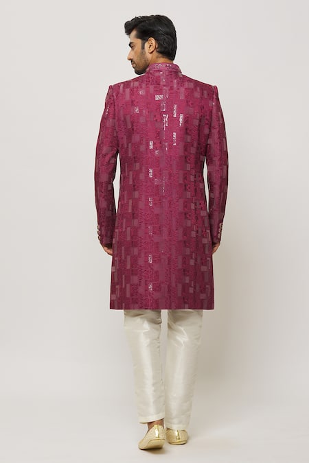 Dark pink sherwani featuring floral hand embroidery and a band collar. Paired with cream dupion art silk pant.