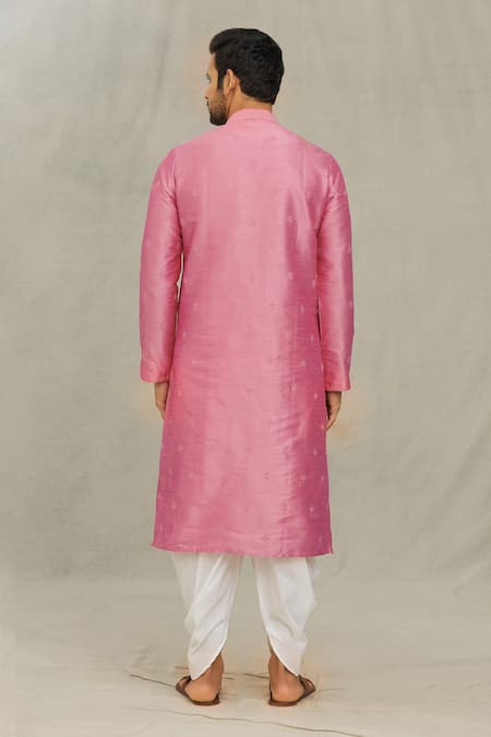 Pink kurta featuring a mandarin collar with all-over floral thread embroidery. Paired with a white pleated cowl draped dhoti pant.