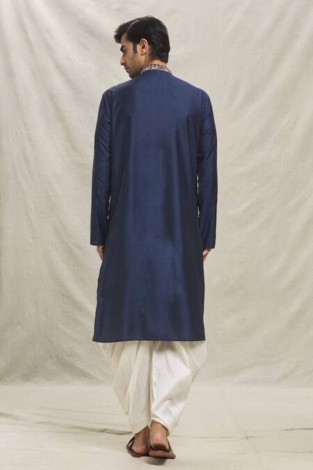 Blue kurta featuring floral thread embroidery and sequin embellishments. Paired with a matching dhoti pant in art silk fabric.