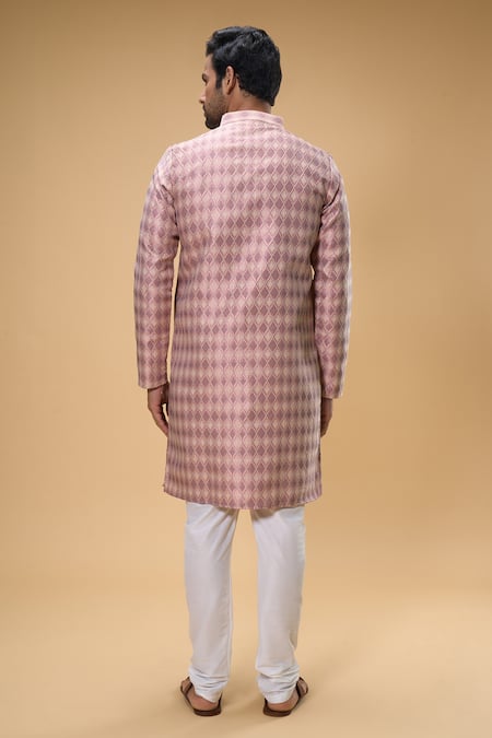 Pink jacquard kurta featuring floral and thread embroidery with a mandarin collar