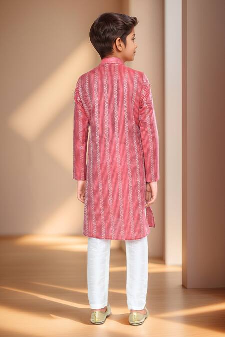 Red kurta featuring floral woven motifs in a stripe pattern. Paired with a contrast solid off-white churidar made from art silk.