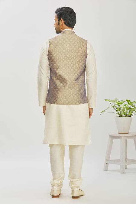 Beige Jacquard, Silk Embroidery Floral Woven Bundi And Kurta Set