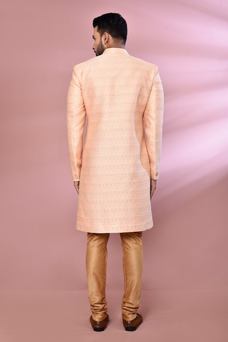 Peach Jacquard, Silk Embroidery Floral Woven Jacket Kurta And Churidar Set