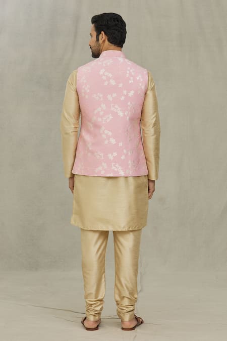 Pink bundi featuring floral woven motifs and a mandarin collared neckline