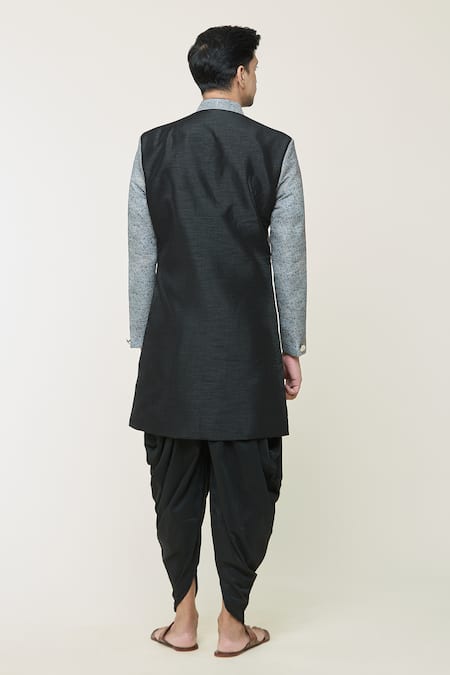 Grey and black floral woven sherwani featuring a mandarin collar and front button closure. Paired with black peshawari pant made from art silk.
