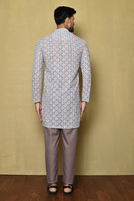 Multi color kurta featuring all over contrast floret checkered print, geometric pattern & tonal chikankari thread embroidery