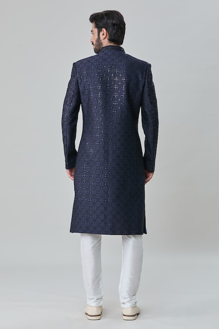 Navy blue sherwani featuring floral embroidery and sequin highlights. Paired with a churidar for a complete look.