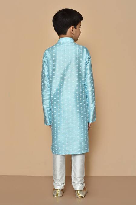 Blue kurta featuring floral embroidery, mandarin collar, and full sleeves. Paired with off-white churidar made from a silk blend fabric.