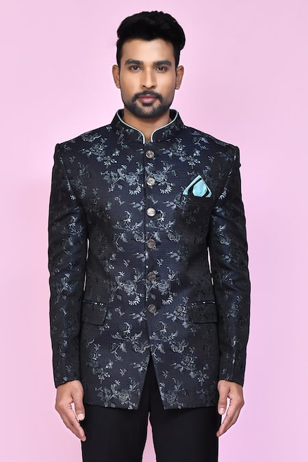 Black bandhgala featuring woven flower and leaf motifs