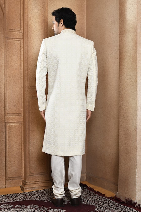 Off white sherwani featuring all over resham jaal embroidery. Paired with a matching churidar made from silk blend fabric.