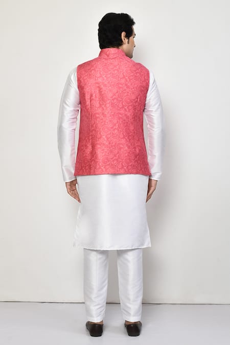 Pink bundi featuring an all-over floral vine pattern. Paired with a white straight kurta and pant.