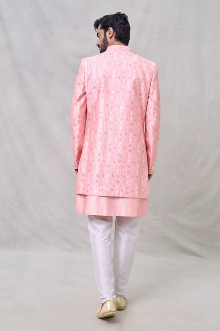 Pink sherwani jacket featuring floral pattern and sequin embroidery. Paired with an inner kurta and aligadhi pant.