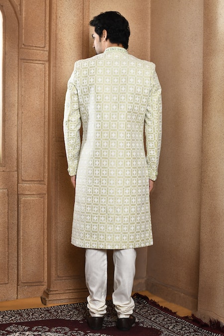 Green sherwani featuring all-over resham jaal embroidery and a stand collar. Paired with an off-white churidar in silk blend fabric.