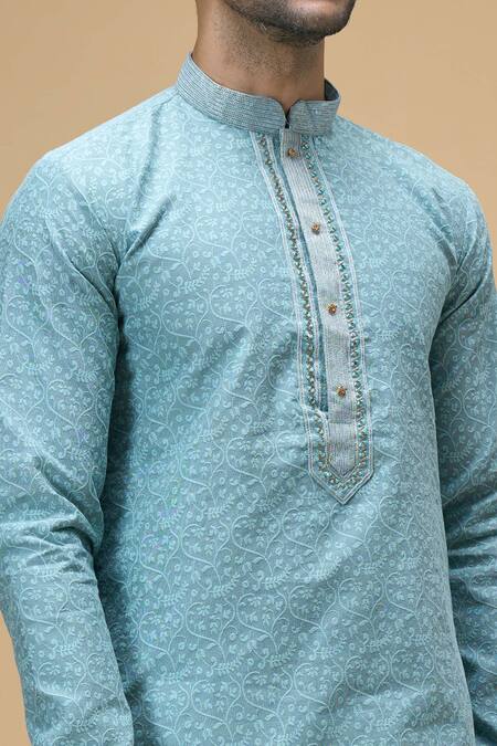 Blue kurta featuring a floral vine woven pattern and a stand collar