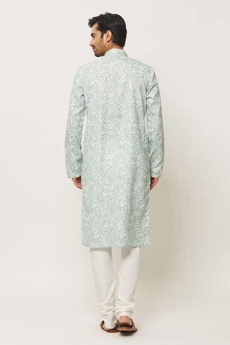Blue kurta featuring a forest print with placed threadwork. Paired with a churidar made of Art Banarasi silk.