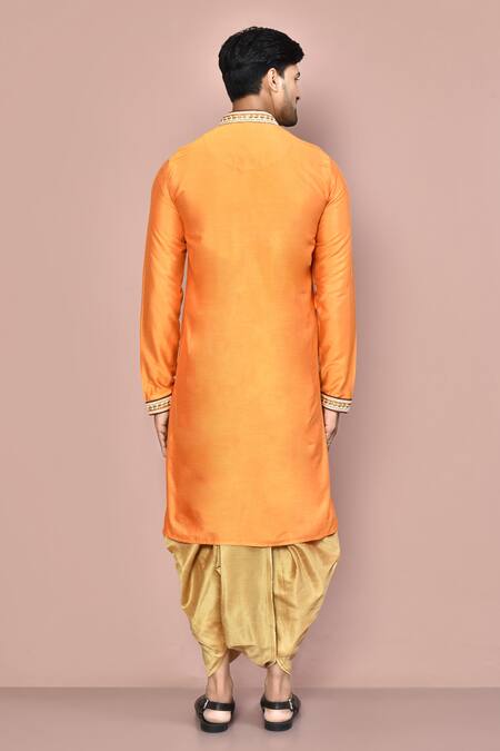 Mustard kurta featuring full sleeves, stand collar, and placement hand zardozi embroidery. Paired with beige dhoti pant with a relaxed fit.