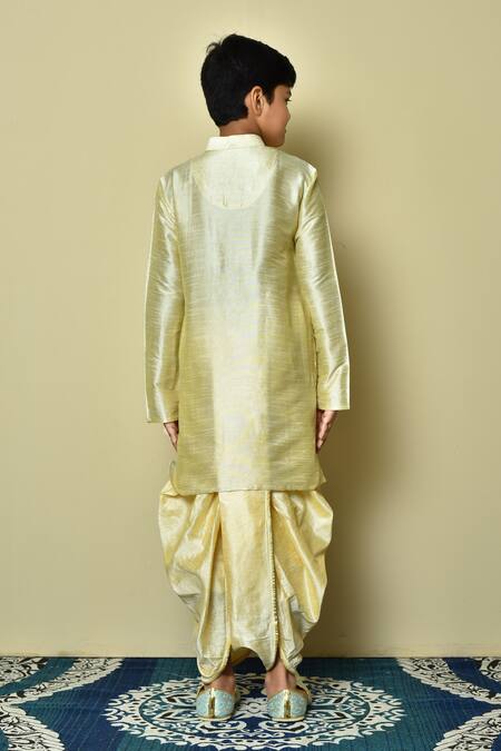 Beige dupion art silk kurta featuring a stand collar and full sleeves. Paired with a beige dhoti for a complete look.