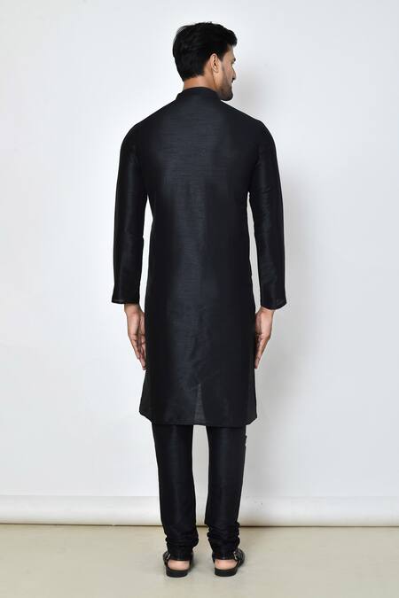Black Dupion Raw Silk Plain Full Sleeve Kurta With Churidar