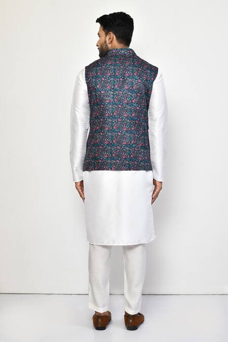 Blue bundi featuring a garden print with a mandarin collar and front buttons. Paired with a white full sleeve kurta and pant, designed for a relaxed fit.
