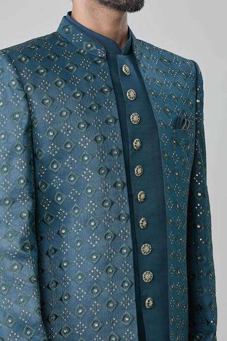 Green Silk Embroidery Geometric Butti Sherwani Jacket Pant Set