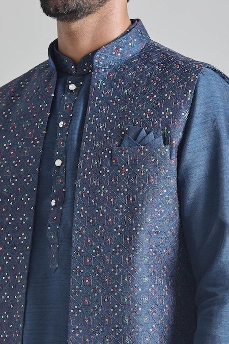 Blue bundi featuring thread embroidered geometric jaal motifs with a side pocket. Paired with a matching kurta and aligadhi pant.