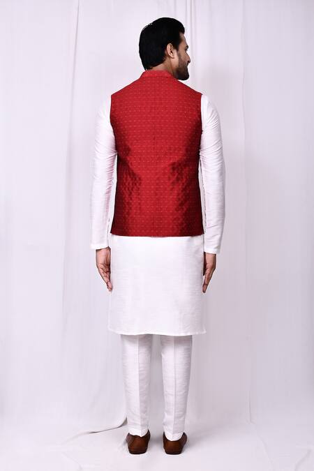Red bundi featuring geometric embroidery and a front button closure. Paired with a white kurta and pant pyjama.