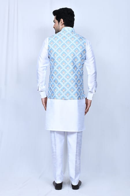 Blue Nehru jacket featuring geometric thread and sequin embroidery with a mandarin collar