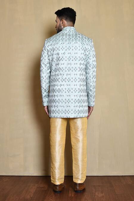 Blue bandhgala featuring floral and geometric woven patterns. Paired with elasticated golden pant.