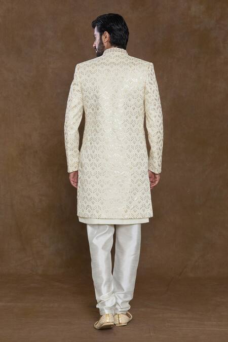 Cream sherwani featuring geometric sequin hand work and embellished front buttons. Paired with a sleeveless kurta, churidar, and a dupatta in pure dola silk.