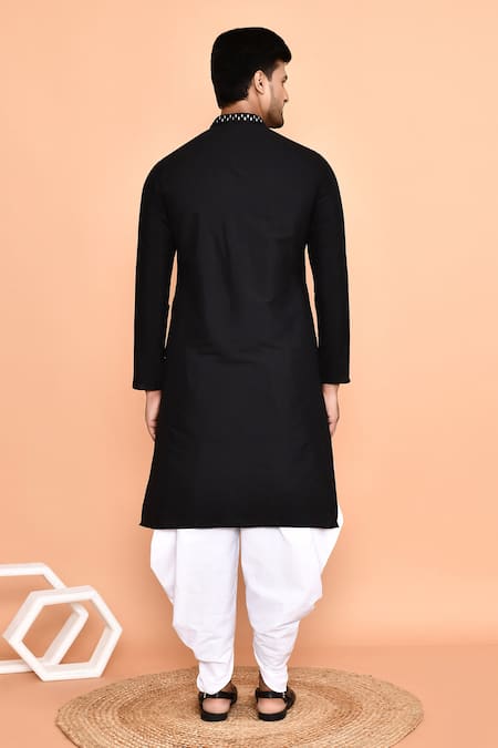 Black kurta featuring geometric mirror and thread embroidery with a mandarin collar. Paired with a solid cream patiyala and includes attached side pockets.