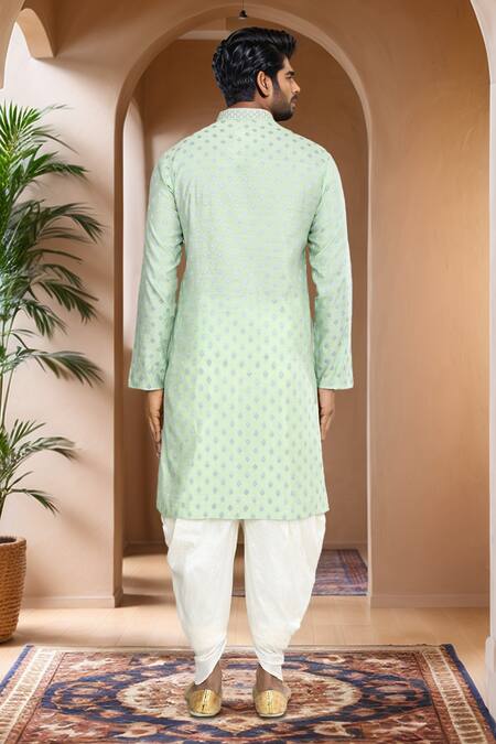 Pista green straight kurta featuring woven geometric motif. Paired with an off-white patiala pant.
