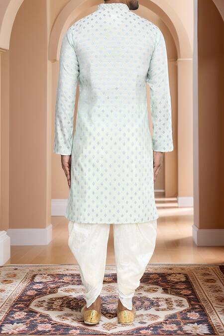 Sea green straight kurta featuring a woven geometric motif. Paired with an off-white patiala pant with an elastic waistband.