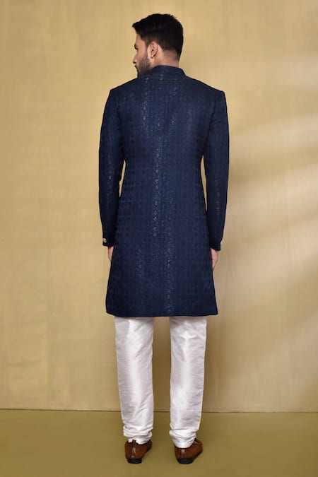 Arihant Rai Sinha_Blue Jacquard, Silk Geometric Pattern Asymmetric Nawabi Kurta Set _Online_at_Aza_Fashions