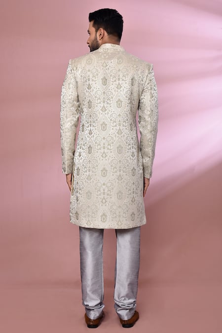 Mehendi green kurta featuring a geometric woven pattern and a mandarin neckline. Paired with a dark grey churidar made from silk blend.