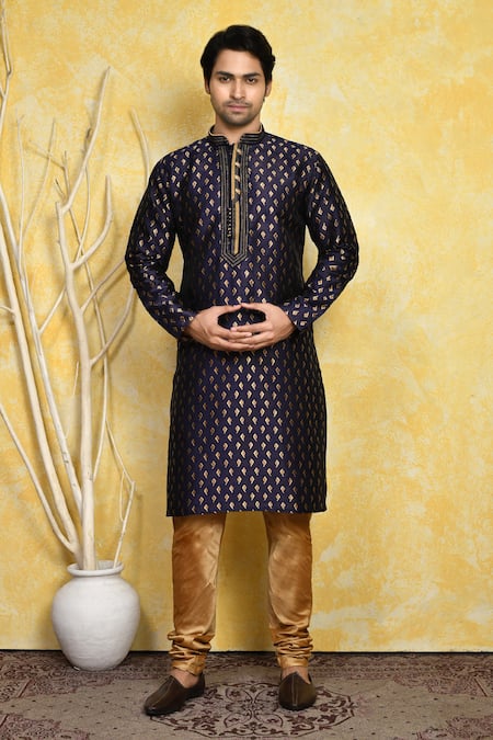 Royal blue kurta featuring a band collar and long sleeves with an embroidered placket. Paired with a beige churidar made from a silk blend fabric.