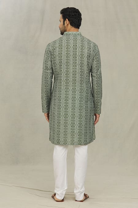 Green kurta featuring a geometric print, mandarin collar, and full sleeves. Paired with a white churidar with a drawstring closure.