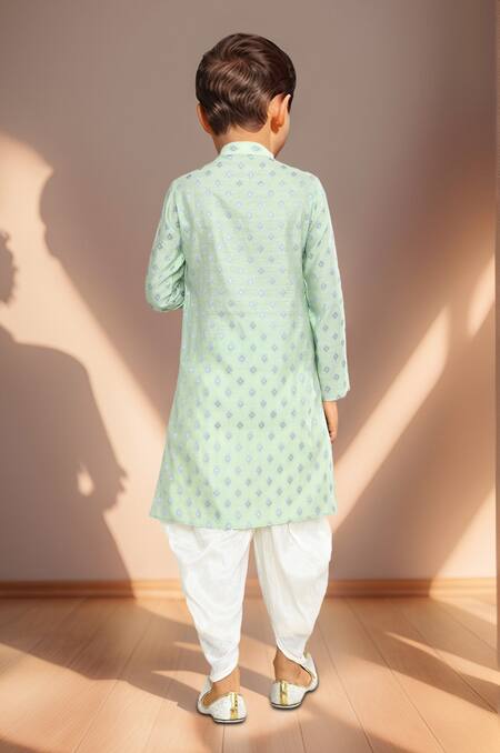 Pista green kurta featuring a mandarin collar and woven geometric butti pattern. Paired with off-white patiala pants with an elasticated waistband.