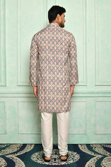 Grey kurta featuring a geometric pattern, mandarin collar, and full sleeves