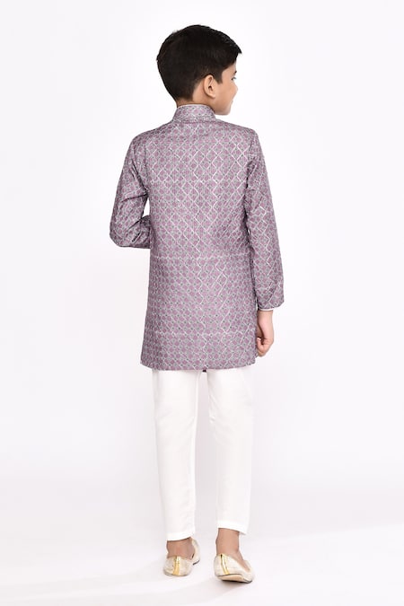 Purple asymmetric sherwani featuring a geometric pattern and band collar. Paired with an off white silk dupion pyjama for a complete look.