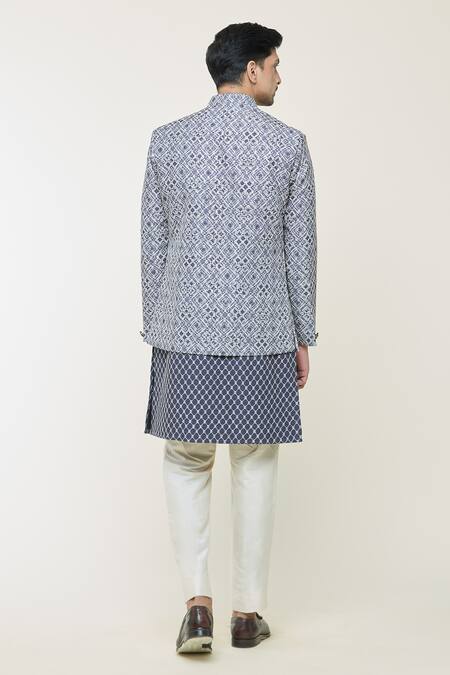 Navy blue full sleeve jacket featuring geometric print and a mandarin collar. Paired with a checkered print sleeveless bundi and pant.